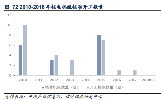 2016 年和 2017 年兩年近開工核準(zhǔn)一臺霞浦核電機(jī)組?!?018 年能源指導(dǎo)意見》指出年內(nèi)計劃開工 6-8 個機(jī)組,目前 2018 年上半年還未有一臺核電機(jī)組獲得開工核準(zhǔn),下半年核電機(jī)組核準(zhǔn)開工數(shù)量主要取決于三門 1 號實(shí)現(xiàn)安全并網(wǎng)發(fā)電速度。由于待核準(zhǔn)核電機(jī)組較多為 AP1000 三代反應(yīng)堆,若三門 1 號下半年實(shí)現(xiàn)并網(wǎng)發(fā)電,我們預(yù)計未來新機(jī)組核準(zhǔn)開工的速度將會加快。
