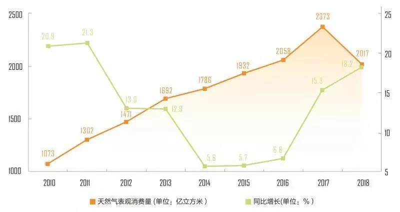 經(jīng)歷了2014-2016年的低速增長后,中國的天然氣消費(fèi)已經(jīng)進(jìn)入了“3”時代,即天然氣年消費(fèi)增長超過300億立方米。2017年中國天然氣消費(fèi)量2373億立方米,比2016年增加了315立方米。