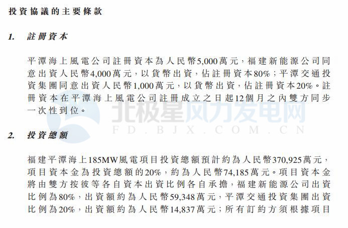 項(xiàng)目資本金福建新能源公司出資比例為80%,出資額約59,348萬元,平潭交通投資集團(tuán)出資比例為20%,出資額約14,837萬元。