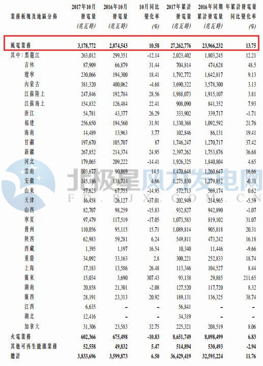 龍?jiān)措娏?017年10月完成發(fā)電量38 34億千瓦時(shí)(3,833,696兆瓦時(shí)),同比增加6 50%。其中,風(fēng)電發(fā)電量31 79億千瓦時(shí)(3,178,772兆瓦時(shí)),同比增加10 58%,其他可再生能源發(fā)電量增加5 47%。截至2017年10月31日,龍
