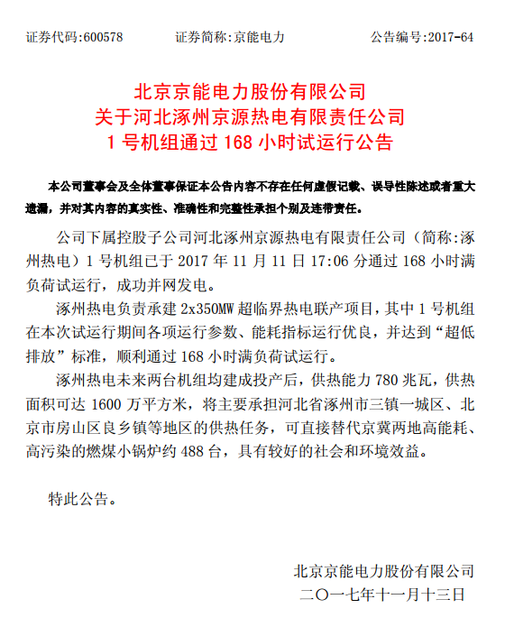 河北涿州京源熱電1號機(jī)組通過168小時(shí)試運(yùn)行