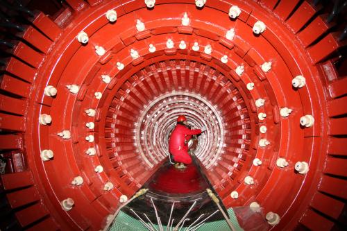 建設(shè)者正在寧夏棗泉電廠1號機組發(fā)電機定子內(nèi)檢查作業(yè)。張軍 攝