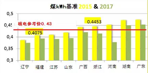 的確,今年有兩個省——廣東和湖南的煤炭價格低于核電參考價。建設(shè)一座燃煤發(fā)電廠(成本為460美元/千瓦)情況會有何不同?技術(shù)難度將比其形式低4到6倍。然而,即便如此,核電銷售價格也并沒有那么遙遠(yuǎn)。