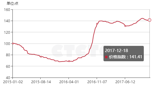 截至2017年12月18日,第229期中國(guó)太原煤炭綜合交易價(jià)格指數(shù)為141.41點(diǎn),環(huán)比下跌0.18%。其中:動(dòng)力煤指數(shù)126.62點(diǎn),環(huán)比上漲0.53%;煉焦用精煤指數(shù)164.89點(diǎn),環(huán)比下跌0.05%;噴吹用精煤指數(shù)158.24點(diǎn),環(huán)比下跌3.50%;化工用原料煤指數(shù)128.04點(diǎn),環(huán)比持平。