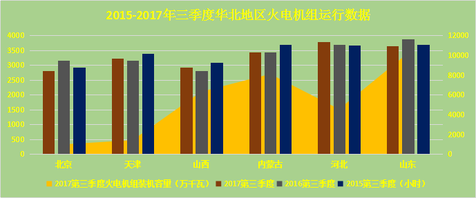 從火電機組設(shè)備利用率上看,三季度,華北地區(qū)處于全國較高水平。其中河北、山東、內(nèi)蒙古、天津,分別達到3798小時、3647小時、3448小時、3239小時,高于全國平均水平681小時、530小時、331小時、122小時。去2016年同期相比,華北各個?。ㄗ灾螀^(qū)、直轄市)有明顯的下降。其中北京、山東、內(nèi)蒙古分別低于去年同期365小時,234小時、3小時。山西、河北、天津則分別則高于去年同期110小時、100小時、68小時。