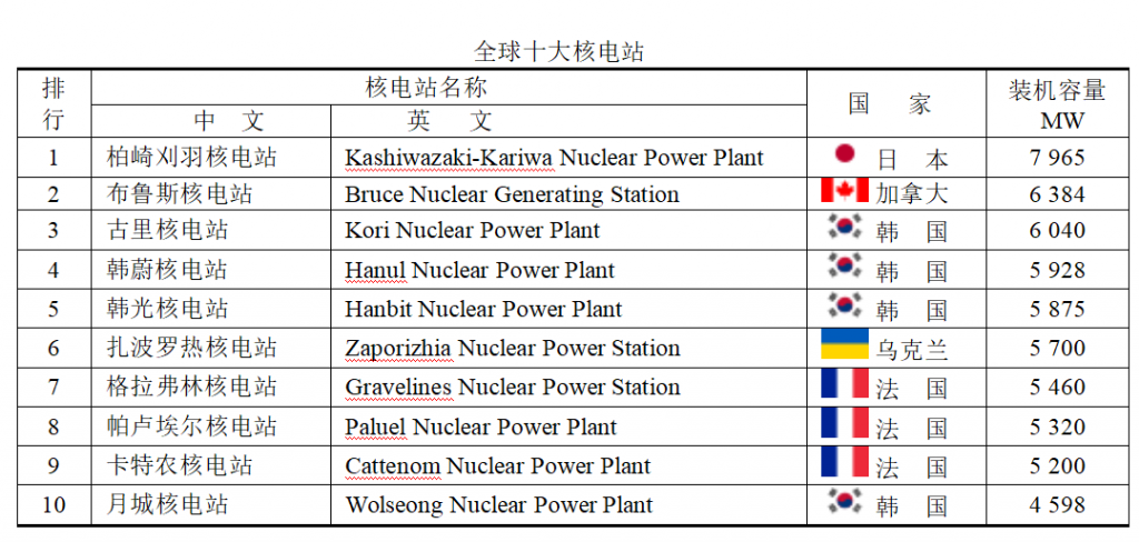 當今全球十大核電站以韓國和法國居多,但世界上最大的核電站是柏崎刈羽核電站(Kashiwazaki-Kariwa Nuclear Power Plant ),建在日本柏崎,屬東京電力公司。有7臺機組,總裝機容量8212MW。1984~1989年建成5臺1100MW沸水堆機組;1990~1992年建成2臺先進的1356MW沸水堆機組。從2011年起就停工了。