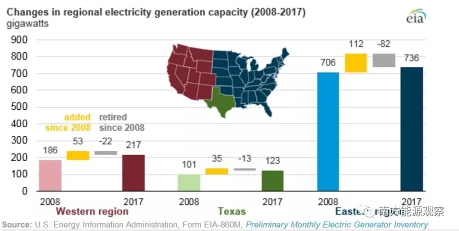 德州的裝機(jī)容量在三區(qū)中最少,至2017年10月,該地區(qū)總裝機(jī)達(dá)123GW。自2008年以來(lái),德州的大部分退役的發(fā)電機(jī)都采用了燃?xì)庹羝褪桶l(fā)電技術(shù)。35%的燃?xì)獍l(fā)電機(jī)組和66%的石油發(fā)電機(jī)組退役;僅532MW的燃煤機(jī)組退役,占德州總裝機(jī)容量的2%。該州向EIA報(bào)告的發(fā)電機(jī)組退役計(jì)劃顯示,2018年德州預(yù)計(jì)將有5583MW的燃煤機(jī)組退役。