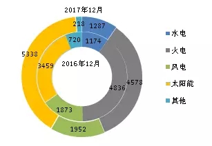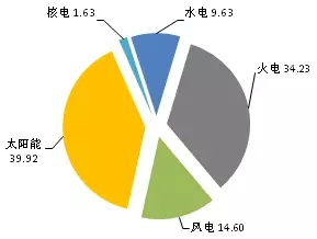 1-12月,全國新增太陽能發(fā)電比重增長明顯,新增火電裝機比重下降較多。其中,新增水電占新增總裝機的9.6%,較上年下降0.08個百分點;新增火電裝機比重達34.2%,較上年下降7.34個百分點;新增核電占1.63%,較上年下降4.31個百分點;新增風電占14.6%,較上年下降2.08個百分點;新增太陽能發(fā)電裝機占39.9%,較上年增加13.8個百分點。