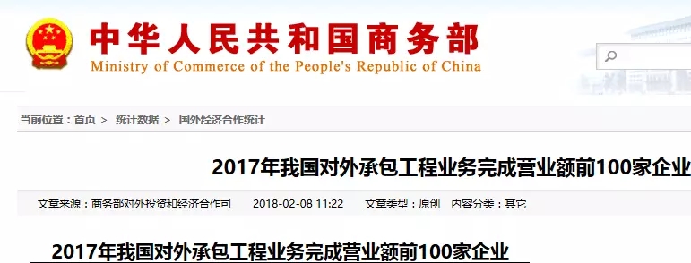 日前,從國家商務部獲悉,2017年我國對外承包工程業(yè)務新簽合同額前100家企業(yè)排名名單、我國對外承包工程完成營業(yè)額前100家企業(yè)排名名單出爐
