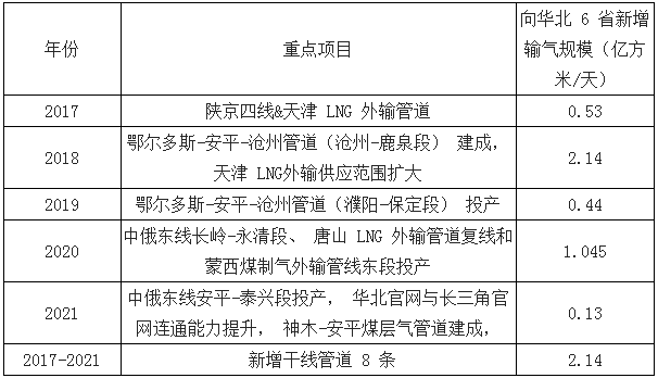 在管道運(yùn)輸方面, 華北 6 省市目前 8 條供氣主干管道總數(shù)其規(guī)模達(dá)到約為 940 億立方米/年(2.7 億立方米/天), 其他 13 條管線總輸氣規(guī)模約 660 億立方米/年(1.9 億立方米/天), 在供暖季, 合計(jì)輸氣規(guī)模為 4.6 億方/天?!兑?guī)劃》 為保障北方 6 省市供暖季天然氣供應(yīng), 提出到 2021 年面向 6 省天然氣管輸供應(yīng)能力較2016 年底增加 6.43 億方/天。