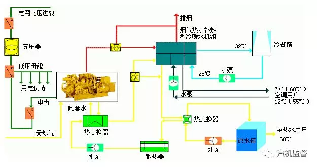 燃?xì)鈨?nèi)燃機(jī)排煙余熱或用來(lái)制熱,或用來(lái)制冷,具體主要根據(jù)用戶需要來(lái)設(shè)計(jì)。制熱的話,一般選用余熱鍋爐,可以提供高溫高壓的蒸汽,也可以提供生活用熱水;制冷的話,一般選用溴化鋰制冷機(jī)。