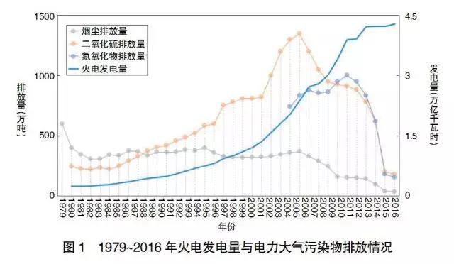 從火電行業(yè)對大氣環(huán)境質(zhì)量影響特性看,2016年火電廠煙氣污染物煙塵(顆粒物)、二氧化硫、氮氧化物三項(xiàng)大氣污染物排放總量,比峰值時(shí)下降了85%以上,每千瓦時(shí)發(fā)電量排放量顯著降低,顯著減輕了對空氣環(huán)境質(zhì)量的影響,已經(jīng)不是造成霧霾影響的主要因素。根據(jù)中電聯(lián)統(tǒng)計(jì)分析,公用火電廠電力顆粒物(煙塵)排放量由2005年的約360萬噸,降至2016年的35萬噸左右;二氧化硫排放量在2006年達(dá)到頂峰1350萬噸,2016年降至170萬噸左右,比峰值下降了87%;氮氧化物排放量2011年達(dá)到頂峰1000萬噸左右,2016年降至155萬噸左右,比峰值下降了85%(見圖1)。從火電單位發(fā)電量污染物排放量看,顆粒物(煙塵)由2005年1.8克/千瓦時(shí)降至2016年的0.08克/千瓦時(shí),二氧化硫由2005年6.4克/千瓦時(shí)降至2016年的0.39克/千瓦時(shí),氮氧化物由2005年3.62克/千瓦時(shí)降至2016年的0.36克/千瓦時(shí)。