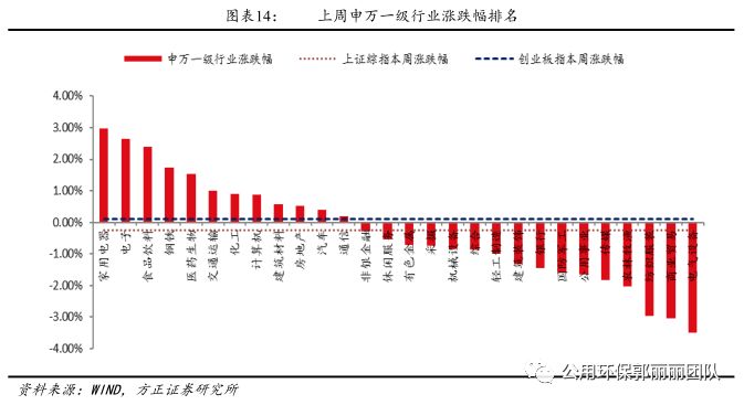 上周電力、燃?xì)狻⑺畡?wù)、環(huán)保工程板塊申萬(wàn)二級(jí)指數(shù)漲跌幅分別為-1.44%、-0.37%、 -1.92%、-2.29%;上證綜指和創(chuàng)業(yè)板指數(shù)漲跌幅分別為-0.26%、0.12%。