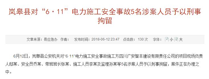 最新進(jìn)展|陜西嵐皋縣對(duì)“6·11”電力施工安全事故5名涉案人員予以刑事拘留