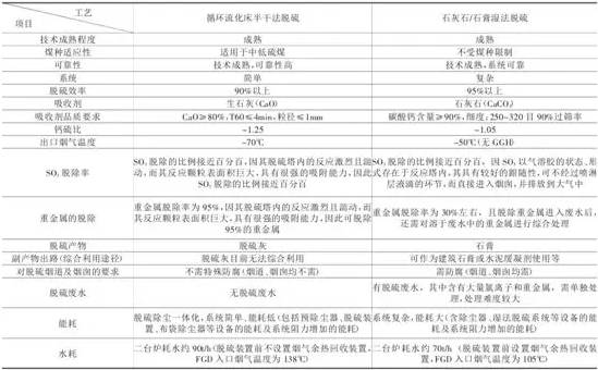 從技術(shù)上比較,本工程選用環(huán)保型CFB鍋爐,本身具有自脫硫優(yōu)勢(shì),爐外脫硫采用半干法和濕法脫硫工藝都能滿足該工程的脫硫效率,且符合《火電廠大氣污染物排放標(biāo)準(zhǔn)》(GB13223-2011)中SO2排放濃度限值100mg/Nm3的要求,兩種方案都可采用。但循環(huán)流化床半干法脫硫工藝與石灰石/石膏濕法脫硫工藝相比,具有系統(tǒng)簡(jiǎn)單、耗水量小、能耗低、煙囪不需防腐和無(wú)脫硫廢水、石膏排放等優(yōu)勢(shì),同時(shí)能夠高效脫除SO3和重金屬汞等,加之本項(xiàng)目采用“低床溫”燃燒技術(shù)的循環(huán)流化床鍋爐,主要以爐內(nèi)脫硫?yàn)橹?,能大大減輕爐外脫硫壓力。