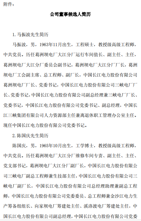 中國長江電力股份有限公司發(fā)布第四屆董事會(huì)第二十六次會(huì)議決議公告,?提名馬振波先生、陳國慶先生、趙強(qiáng)先生為公司第四屆董事會(huì)非獨(dú)立董事候選人,任期自股東大會(huì)審議通過之日起,至第四屆董事會(huì)任期屆滿時(shí)結(jié)束;聘任陳國慶先生擔(dān)任公司總經(jīng)理。