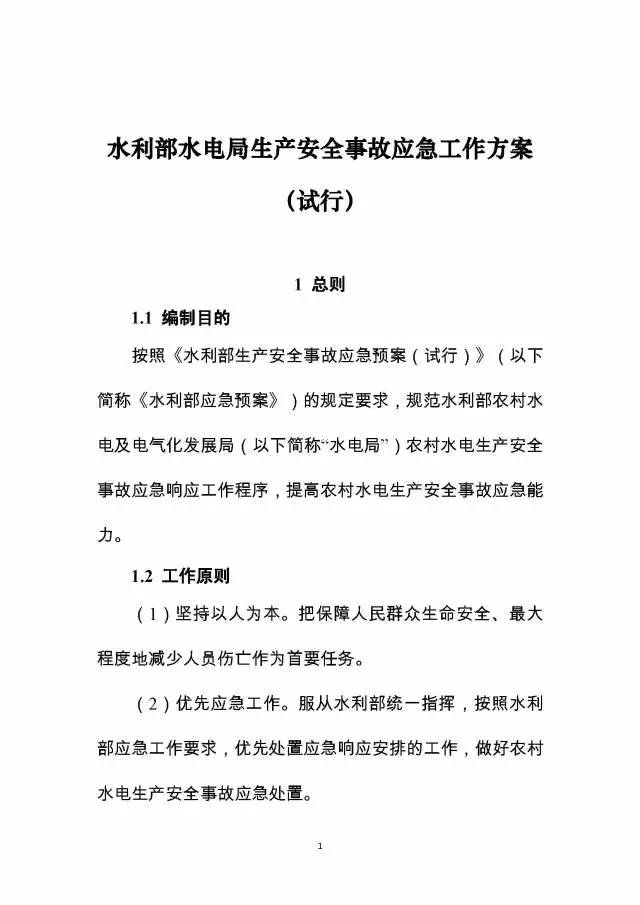 8月29日,水利部發(fā)布《水利部水電局生產(chǎn)安全事故應(yīng)急工作方案(試行)》,原文如下: