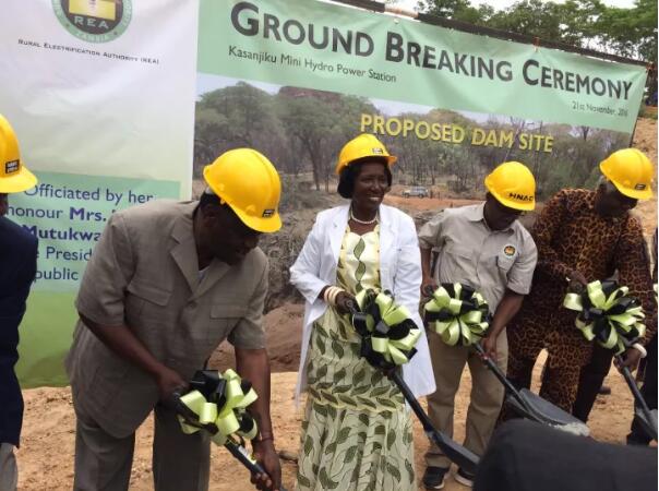 上圖說明:華自科技第一個海外EPC總包項目——贊比亞卡山吉庫水電站于2016年6月10日正式開工建設(shè),該項目由贊比亞農(nóng)村電氣化管理局投資建設(shè),同年11月21日,項目主體工程舉行動工儀式,贊比亞副總統(tǒng)伊農(nóng)格-維納(女)出席儀式,并為動工儀式剪彩致辭。