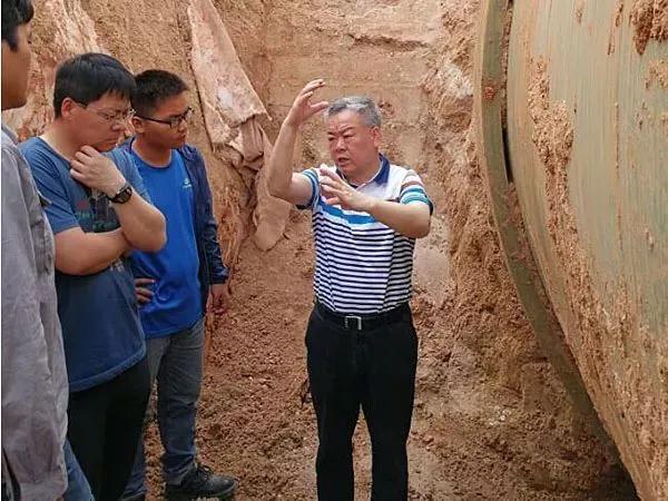 2017年6月,鄧銘江(右一)與施工現(xiàn)場(chǎng)技術(shù)人員交流。(新疆額爾齊斯河流域開(kāi)發(fā)工程建設(shè)管理局提供)