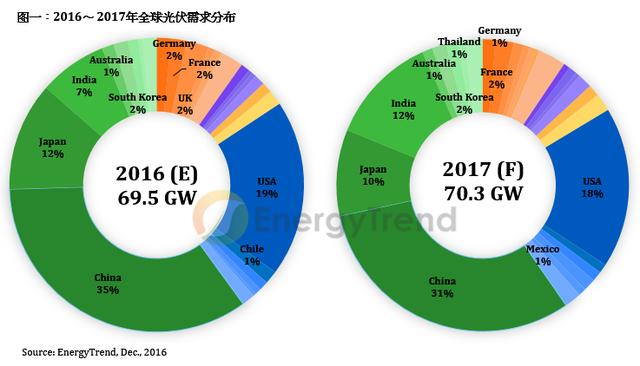 印度及新興市場的成長幅度未能彌補中、美、日的需求衰退,一線組件廠為鞏固出貨,其2017年報價頻破底,預估組件市場均價將由2017年初的US$ 0.38/W,跌至年底的US$0.33/W,不僅中上游廠商將面臨極大虧損,一線組件廠也難維持過去15%以上的毛利區(qū)間。整體而言,2017年光伏供應鏈由上至下利潤都將低于2016年水平。