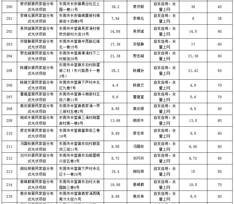 廣東東莞224個家庭分布式光伏項目備案信息表