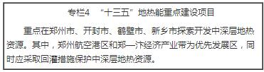 加大地熱能開發(fā)利用研究,完善地熱能開發(fā)利用相關(guān)標準、政策、價格等行業(yè)管理體系。以“地熱水循環(huán)利用”為指導原則,積極推進水熱型地熱供暖,進行傳統(tǒng)供暖區(qū)域的清潔能源供暖替代,將水熱型地熱能供暖納入城鎮(zhèn)基礎(chǔ)設(shè)施建設(shè)中,集中規(guī)劃,統(tǒng)一開發(fā)。按照“因地制宜,集約開發(fā),加強監(jiān)管,注重環(huán)保”的原則,除城鎮(zhèn)地下空間利用規(guī)劃的區(qū)域外,在公共建筑和新建住宅小區(qū)等區(qū)域鼓勵開發(fā)利用淺層地熱能。通過技術(shù)進步、規(guī)范管理解決目前淺層地熱能開發(fā)中出現(xiàn)的問題。結(jié)合大氣污染治理,重點在鄭州、開封、鶴壁、新鄉(xiāng)等清潔供暖試點城市探索開展地熱能發(fā)電示范項目。到2020年,新增地熱能供暖面積8200萬平方米。