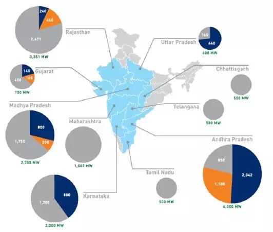 太陽能公園,印度政府計劃于2020年建成共計40GW的太陽能公園,并提供12億美元的資金支持,目前,已建成8.9GW。