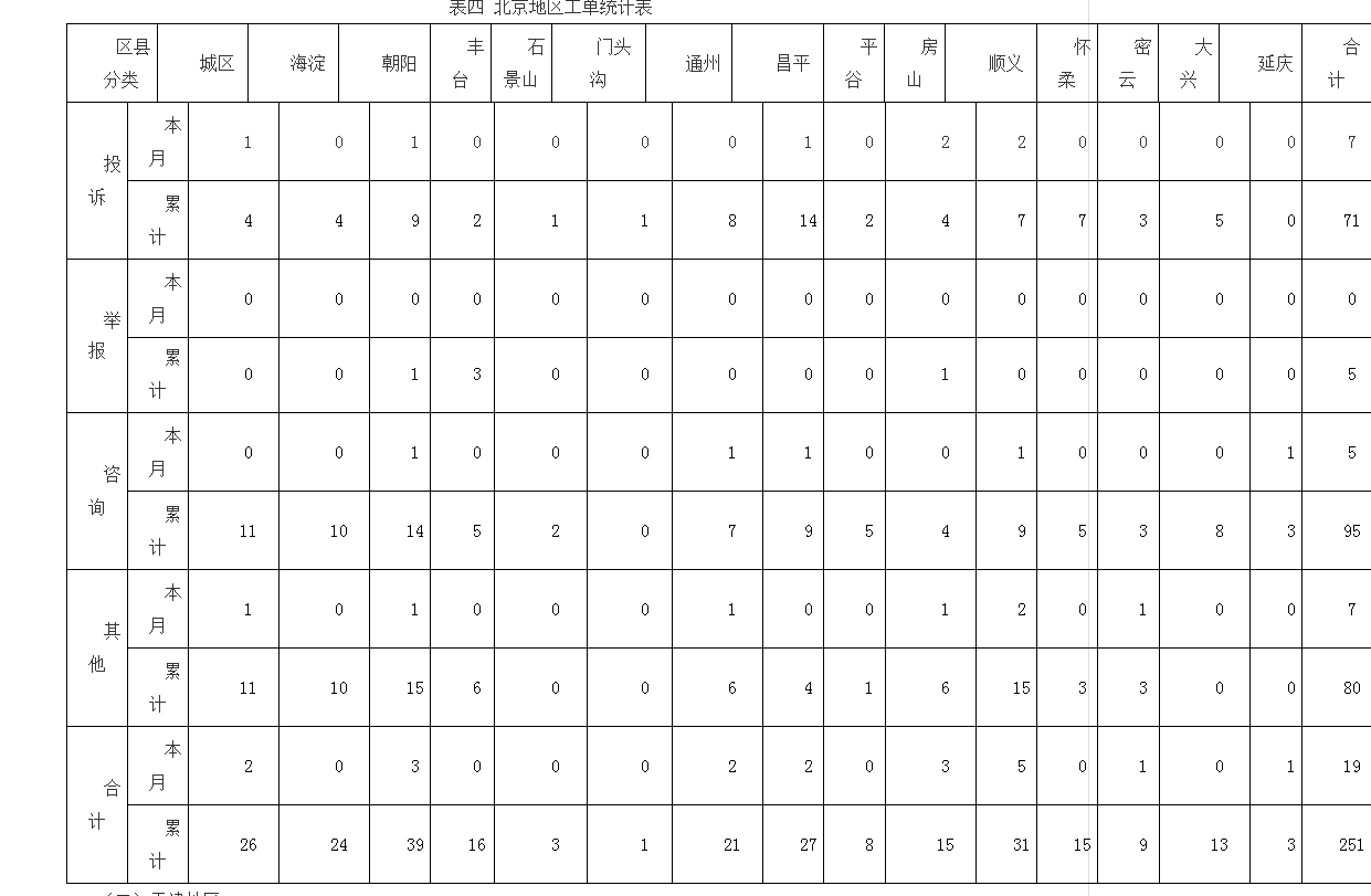 本月,北京地區(qū)工單共19件,其中投訴7件,咨詢5件,其他7件。(北京地區(qū)工單統(tǒng)計表見表四)