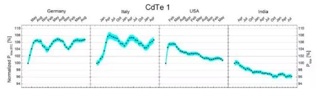 & 9658;c-Si晶體硅和HIT組件基本上隨時(shí)間穩(wěn)定持續(xù)衰減。& 9658;碲化鎘CdTe組件具有1-4個(gè)月的隨溫度影響的亞穩(wěn)態(tài)波動(dòng),然后穩(wěn)定持續(xù)衰減。& 9658;銅鋅錫硫CIGS組件具有1-12個(gè)月無(wú)規(guī)律的亞穩(wěn)態(tài)波動(dòng),然后穩(wěn)定持續(xù)衰