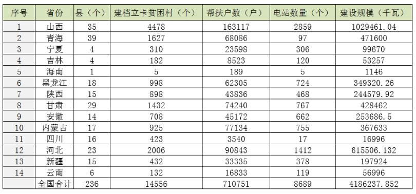 2017年12月29日,國(guó)家能源局與扶貧辦發(fā)布了《關(guān)于下達(dá)“十三五”第一批光伏扶貧項(xiàng)目計(jì)劃的通知》,如期將第一批扶貧項(xiàng)目指標(biāo)在在2017年的最后幾天進(jìn)行了公布,涉及14個(gè)省(自治區(qū))、236個(gè)光伏扶貧重點(diǎn)縣的總規(guī)模4186.237852MW的光伏扶貧項(xiàng)目獲得批準(zhǔn),面向的扶貧對(duì)象為14556個(gè)建檔立卡貧困村的71.0751萬(wàn)戶建檔立卡貧困戶。