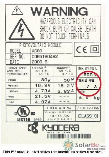 我們會發(fā)現(xiàn)在光伏組件的標(biāo)簽上都會標(biāo)注有“series fuse”或“Maximum Series Fuse“一項,即與組件串聯(lián)的熔斷器的最大電流等級。
