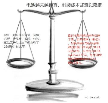 近來隨著多晶電池片價格的不斷下跌,發(fā)生了一件具有歷史意義的事情,那就是一片60型組件的電池成本已經(jīng)低于封裝成本。未來組件價格下滑很難再依靠電池價格的下滑?,F(xiàn)在一張效率<18.6%的多晶電池片的價格約為3.77元;那么一片組件所需的60張電池片成本為3.77×60=226元。而現(xiàn)在一片組件的含稅成本已經(jīng)高達185×1.16=214.6元。
