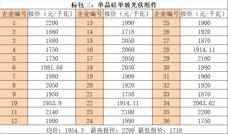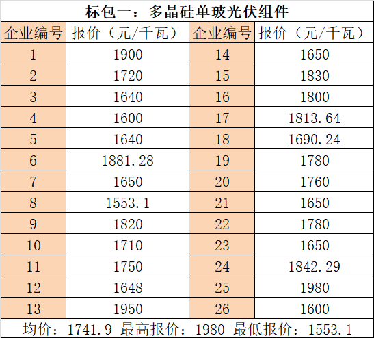以下為此次招標(biāo)組件企業(yè)報(bào)價(jià)信息(數(shù)據(jù)來(lái)源于光伏們):