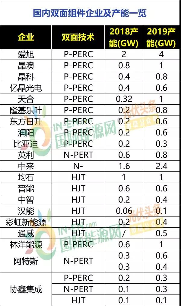 全球共有40家光伏企業(yè)生產(chǎn)雙面組件,國內(nèi)生產(chǎn)企業(yè)有晶澳、晶科、億晶、天合、隆基、東方日升等17家。2018年全球雙面組件規(guī)劃產(chǎn)能超過15GW(若以第四季廠商開始投入生產(chǎn),實(shí)際產(chǎn)能約為3.75GW)。預(yù)估2019年雙面組件規(guī)劃產(chǎn)能可達(dá)25.74GW,為雙面組件成長年。