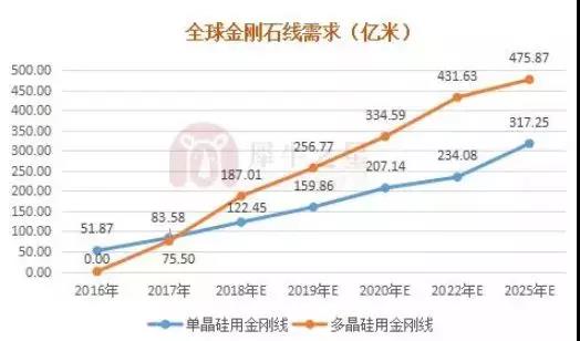 從金剛線市場(chǎng)需求來看,2018年全球硅片用金剛線需求有望達(dá)到309億米,其中單晶硅用金剛線需求約為122億米,多晶硅用金剛線需求約為187億米,2020年全球總需求為567億米。2018年末,13家金剛線廠商的規(guī)劃總產(chǎn)能將達(dá)到919億米,金剛線行業(yè)將進(jìn)入產(chǎn)能過剩階段。
