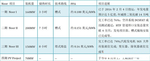 如圖所示,160MW的NoorI槽式光熱電站(3小時(shí)儲(chǔ)熱時(shí)長)已于2016年2月4日投運(yùn),電價(jià)為1.62迪拉姆/kWh,約合1.183人民幣/kWh;200MW的NoorII槽式光熱電站(7小時(shí)儲(chǔ)熱時(shí)長)的完工率已達(dá)76%;150MW的NoorIII塔式熔鹽光熱電站(8小時(shí)儲(chǔ)熱時(shí)長)的完工率也已達(dá)74%;今年4月,該項(xiàng)目第四階段(最后階段)的70MWNoorQuarzazateIV光伏電站正式動(dòng)工,這標(biāo)志著全部電站項(xiàng)目進(jìn)入建設(shè)階段。