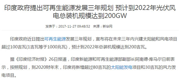 整個印度,人口和我們中國不相上下,但其電力總裝機(jī)量在400Gw左右,而我國的總裝機(jī)量約2000Gw,大家可以想想這個差距有多大,而這是一個十分巨大的市場。而光伏在印度,已經(jīng)是最廉價的能源之一了,同時印度政府也在2014年的提出了2020年要建造100Gw的光伏電站,同時,也在近期又進(jìn)一步提出在2022年要將光伏與風(fēng)電的總規(guī)模達(dá)到200Gw的目標(biāo):