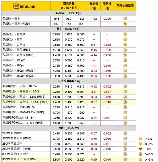 我們看到,正是在這樣的政策環(huán)境下,疊加短期的供應(yīng)需求關(guān)系(中國也是傳統(tǒng)的淡季),目前光伏各個環(huán)節(jié)的價格,出現(xiàn)了下滑,其中下滑最厲害的便是電池片環(huán)節(jié)。根據(jù)PVInfoLink的價格顯示: