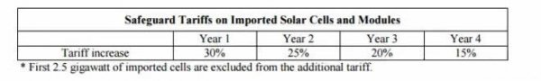 其中,對進(jìn)口產(chǎn)品的保障關(guān)稅將執(zhí)行4年,首年稅率為30%,隨后年降5%,至2021年稅率將為15%。