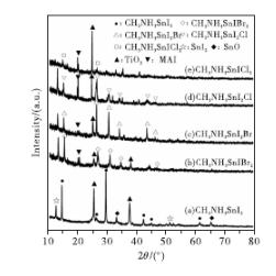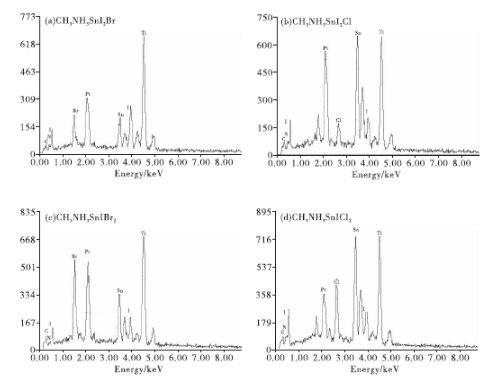 CH3NH3SnI3成分的鈣鈦礦薄膜具有最低的禁帶寬度增加,降低其在可見光范圍內(nèi)的吸光性能,過多的Br-、Cl-會導(dǎo)致鈣鈦礦薄膜結(jié)晶性能降低。
