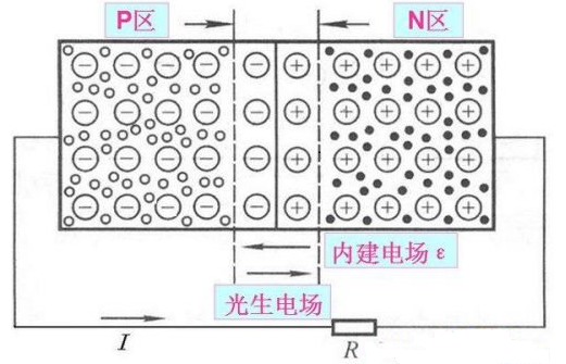 光生電場使得P區(qū)帶正電,N區(qū)帶負電,從而N區(qū)和P區(qū)之間就會產(chǎn)生電動勢,這就是光生伏打效應。當電池接上負載R后,光電流就可以從P區(qū)經(jīng)負載流至N區(qū)。負載據(jù)此效應就可以得到一定的功率輸出。