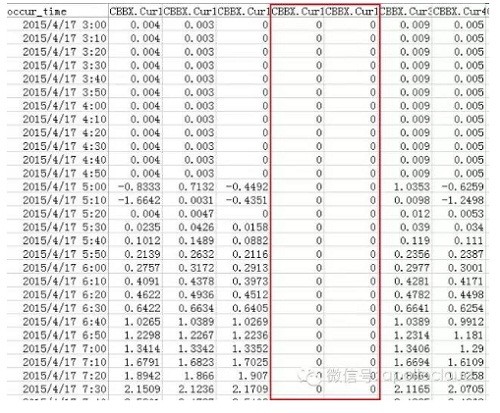 數(shù)據(jù)被認為是人類目前為止發(fā)現(xiàn)的第五維空間,在這里,許多低緯度問題都將迎刃而解。我們堅定地相信,一切現(xiàn)實中的問題在數(shù)據(jù)世界都有解(第五維解)。于是我們大量觀察匯流箱數(shù)據(jù),尤其是那些我們已經(jīng)確切知道有多少組串接入的匯流箱。如下是南通某項目的匯流箱數(shù)據(jù),我們知道第1,2,13,14,15,16路是空接,從數(shù)據(jù)上看,這6路電流都顯示為0,于是我們得到初步結(jié)論:沒有接入電流的支路顯示的都是0!并由此推及:一直顯示為0的支路沒有接入組串。
