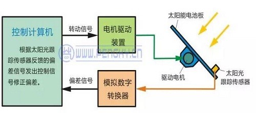 同樣為保證跟蹤的準(zhǔn)確性,要有電池板軸轉(zhuǎn)動(dòng)的角度檢測(cè)傳感器把角度信號(hào)反饋給計(jì)算機(jī)。