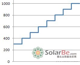 以EN50530為例,其對于輻照度變化速率的最快的要求是100W/m2/s,以7秒鐘實現(xiàn)從300W/m2到1000W/m2的變化。如果我們只是采納1秒鐘變化一次輻照度的方法,則將得到如下的以1秒為步進的階梯狀輻照度變化圖檔(圖2),而非標準所要求的線性變化狀輻照度圖檔(圖3)。