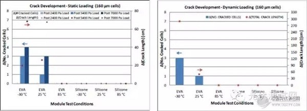 從圖中看出,當環(huán)境溫度常溫或較高溫度時,EVA和有機硅封裝材料一樣有良好的彈性,靜態(tài)及動態(tài)機械載荷性能差不多。但在-20℃以下時,EVA封裝的組件在機械載荷測試中產(chǎn)生的電池片隱裂遠高于有機硅封裝的組件。這也進一步說明了極低溫度下EVA的彈性確實有明顯的下降甚至消失,對電池片的保護作用大大降低,在產(chǎn)生形變的過程中其剛性、脆性反而對促使了電池片隱裂的產(chǎn)生。