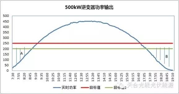 上述考慮的情況是基于AGC均勻分配的情況下,但事實(shí)上AGC不可能均勻分配,假設(shè)A逆變器限定有功250kW,B逆變器限定有功200kW,如果按照功率大于250kW充電策略,紅綠線與功率曲線包圍的面積這部分電力無(wú)法被電池儲(chǔ)存,遇到逆變器限定功率分配不均的情況,可選取合適值,使得整個(gè)電站的功率補(bǔ)償最大化,參考圖5。