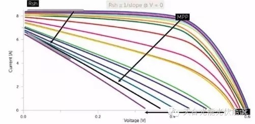 晶硅組件發(fā)生PID后,其I-V曲線形狀會出現(xiàn)異常,電性能參數(shù)表現(xiàn)為Rsh、填充因子和開路電壓Voc的降低。PID越嚴(yán)重,其曲線移動的趨勢就如圖15箭頭所示。而對于輕微PID組件,其IV曲線的異常特征不太明顯,還需結(jié)合下面的方法(開路電壓法、EL)進(jìn)行綜合分析。