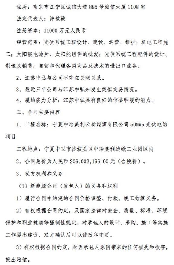 根據(jù)公開招標(biāo)結(jié)果,江蘇中弘光伏工程技術(shù)有限公司為50MWp光伏電站EPC總包項目中標(biāo)單位,新能源公司與其簽訂了《50MWp光伏電站EPC總包項目工程總承包合同》,合同總價為人民幣2.06億元(含稅價)。折合單價約為4.12元/瓦。