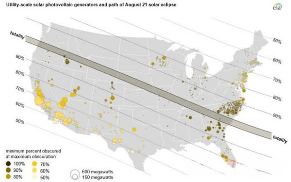 EIA預(yù)計(jì),在日全食發(fā)生的3分鐘內(nèi),有17座太陽能電廠會(huì)陷入完全的黑暗,它們主要位于俄勒岡州東部。而在北卡羅來納州和佐治亞州的上百座電廠則會(huì)面對太陽被遮蓋超過九成的狀況,全美在日食食分超過0.7區(qū)域的太陽能發(fā)電場則最少會(huì)損失6000兆瓦的發(fā)電能力。