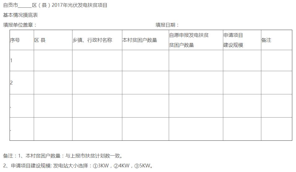 請(qǐng)各區(qū)縣發(fā)改局、扶貧移民辦(局)于8月28日前以聯(lián)合正式文件上報(bào)2017年光伏扶貧項(xiàng)目摸底調(diào)查表連同電子版一并分別報(bào)送市發(fā)展改革委、市扶貧移民局。